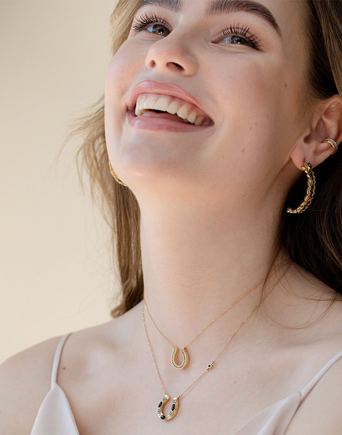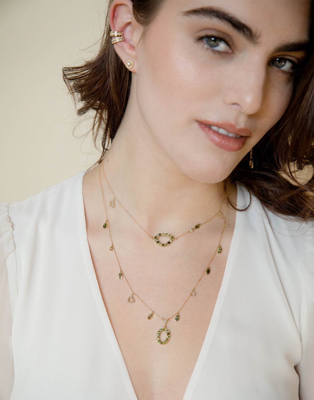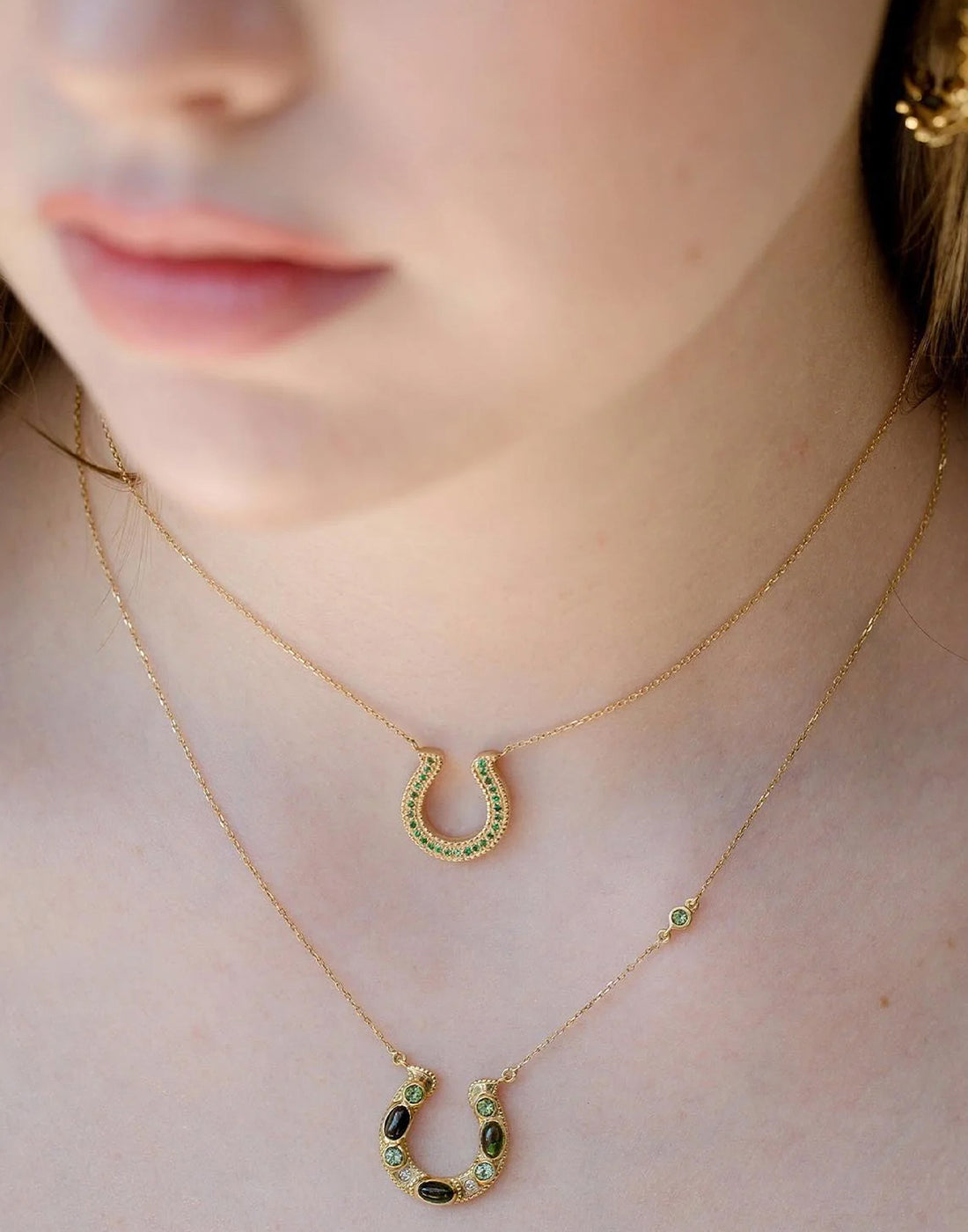 Horseshoe Tsavorite Necklace on model — 18k yellow gold, green tsavorite pavé, layered with second horseshoe, close-up front view