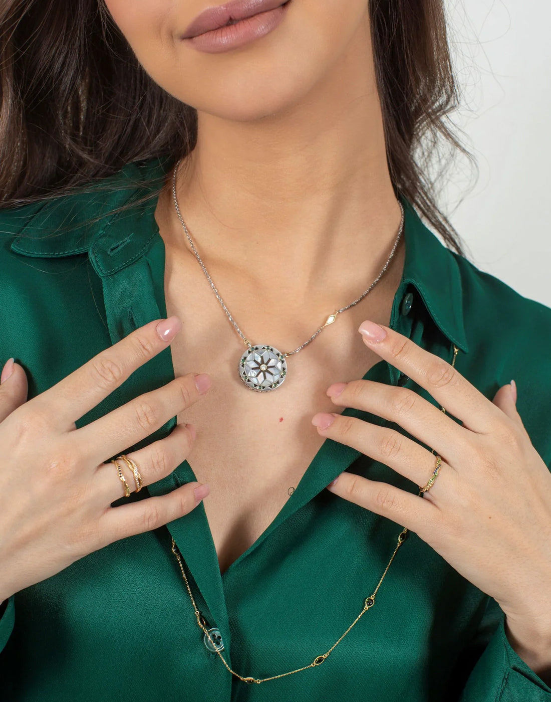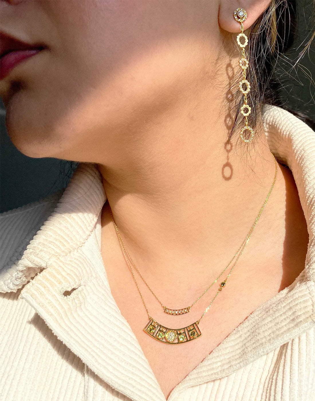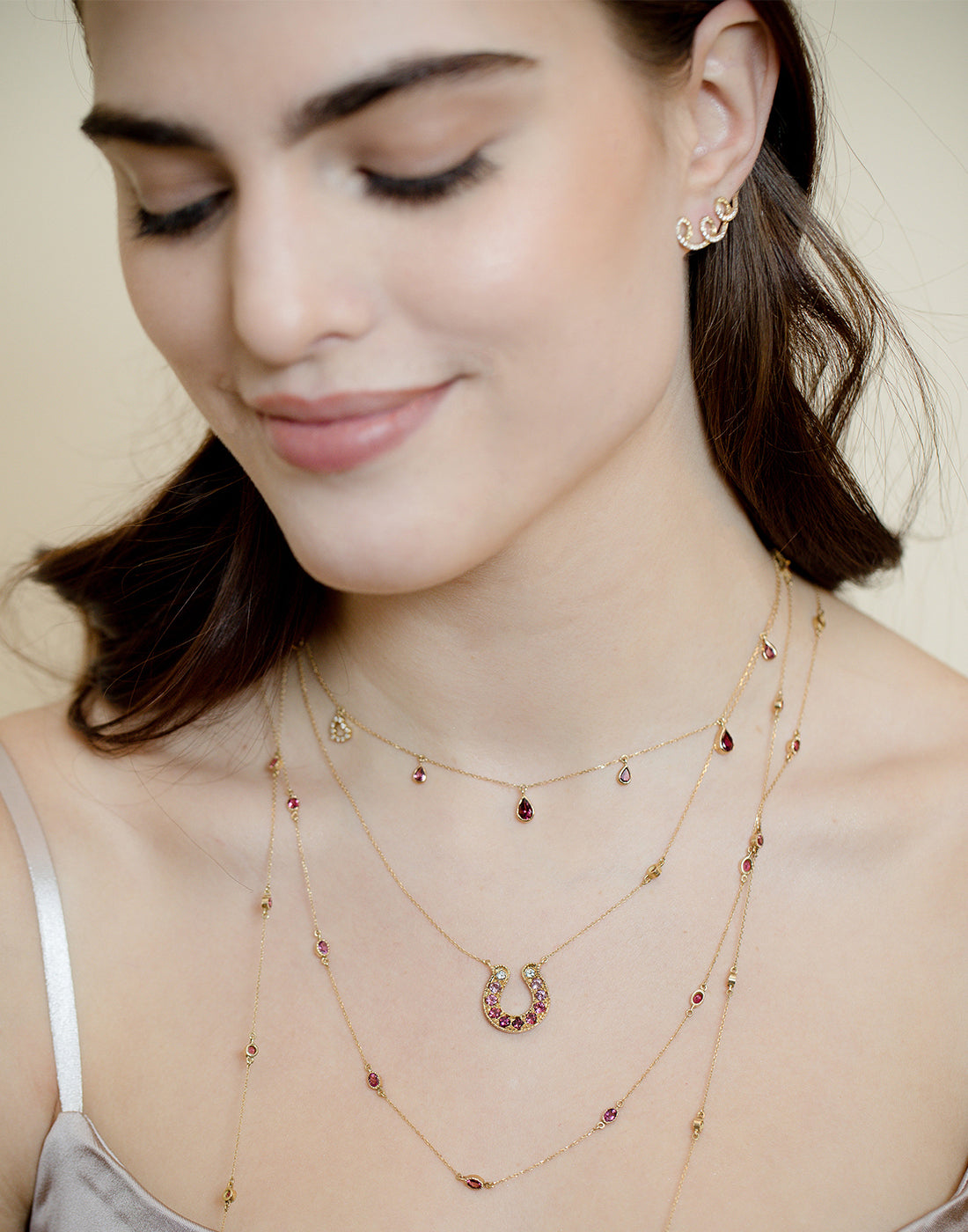 Horseshoe Tsavorite Necklace on model — 18k yellow gold, green tsavorite pavé, layered with second horseshoe, close-up front view