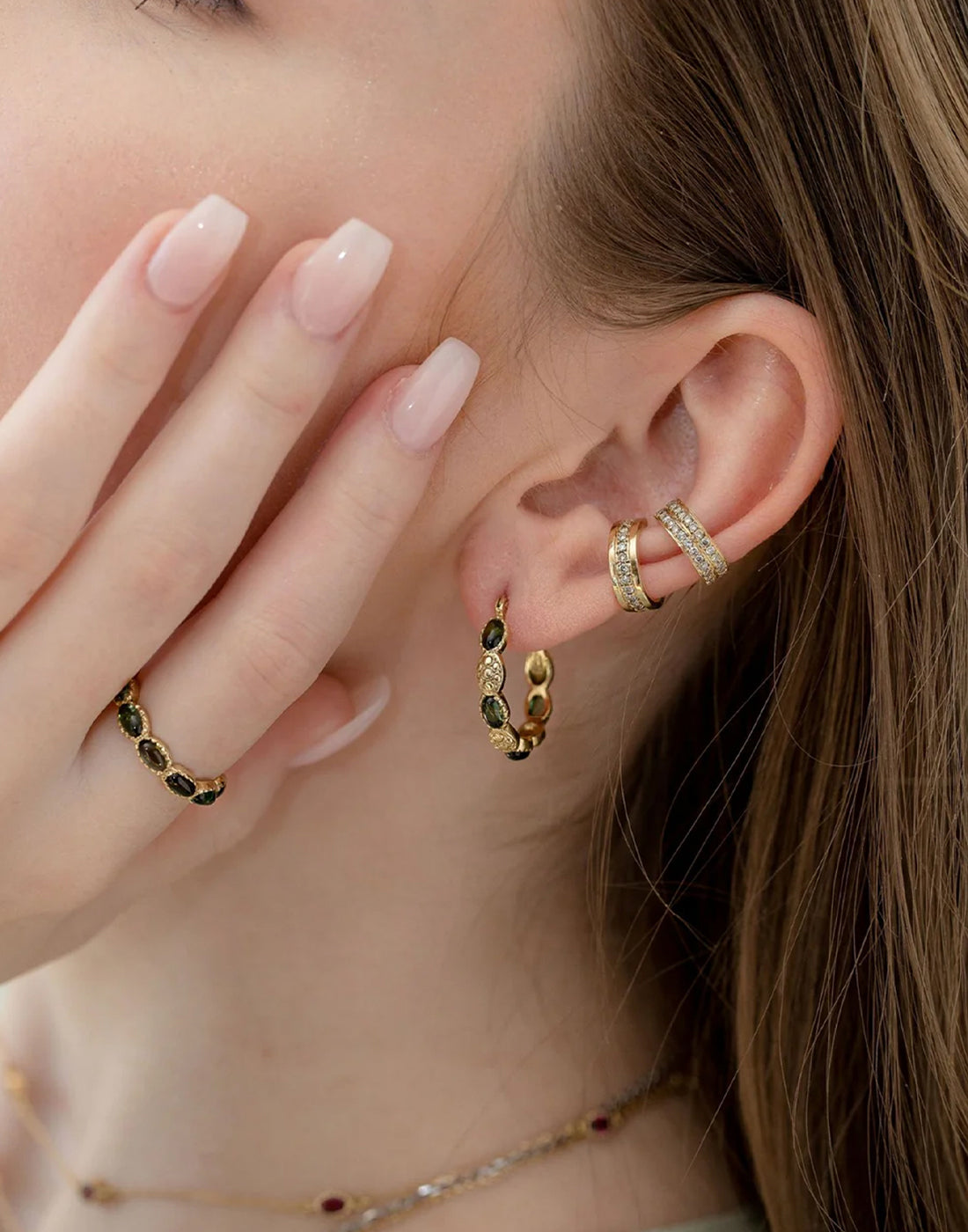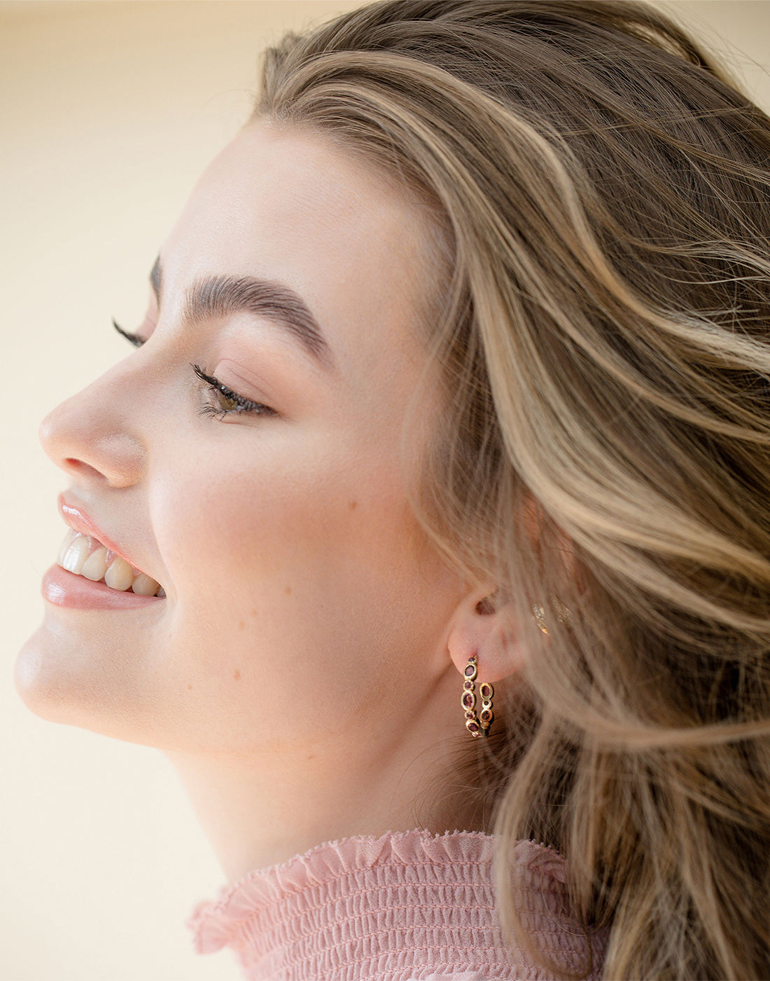 A close-up of a model wearing the gold pink tourmaline hoop earrings