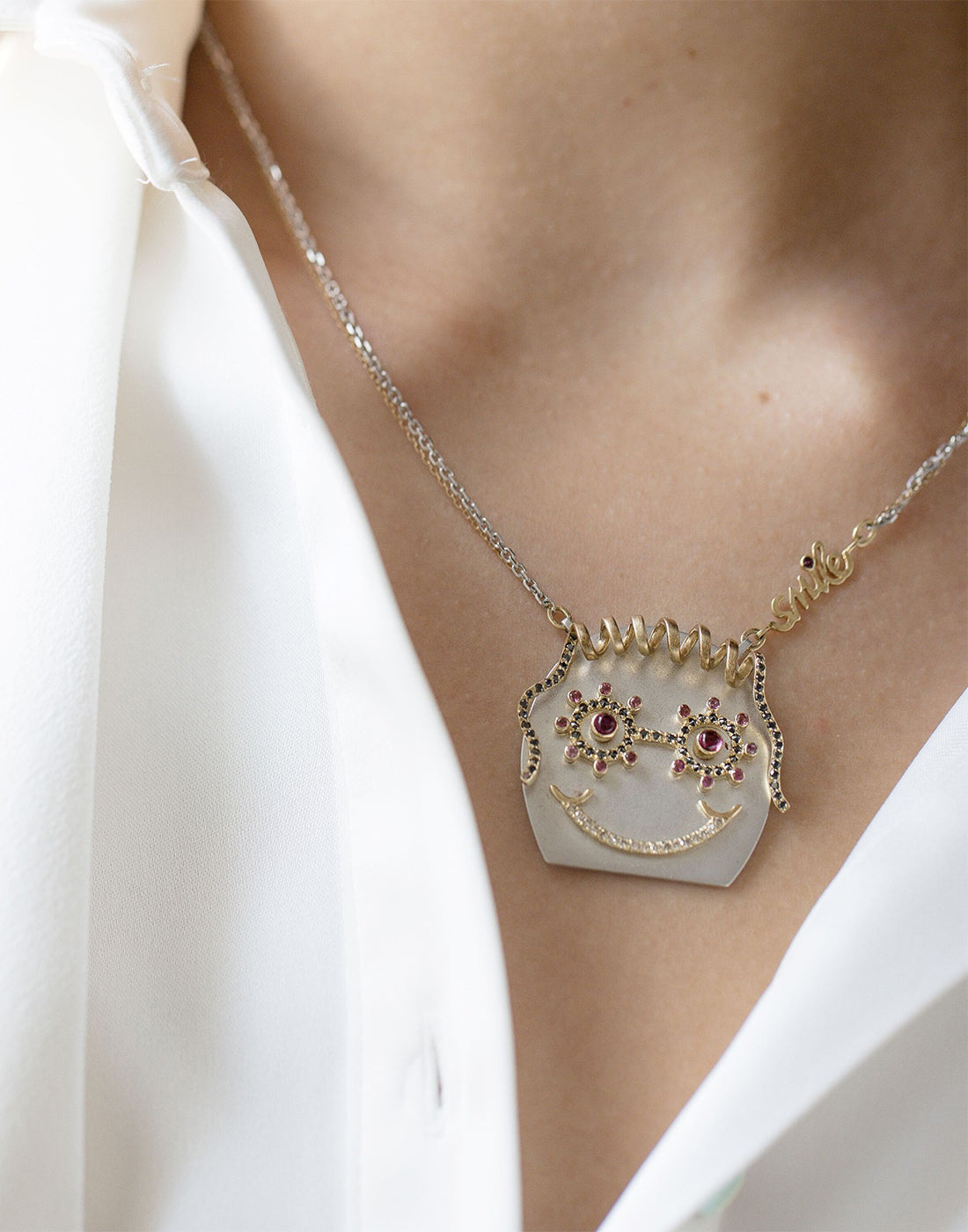 model wearing Gold & silver smiley face necklace, curly hair, black diamond glasses, diamond smile